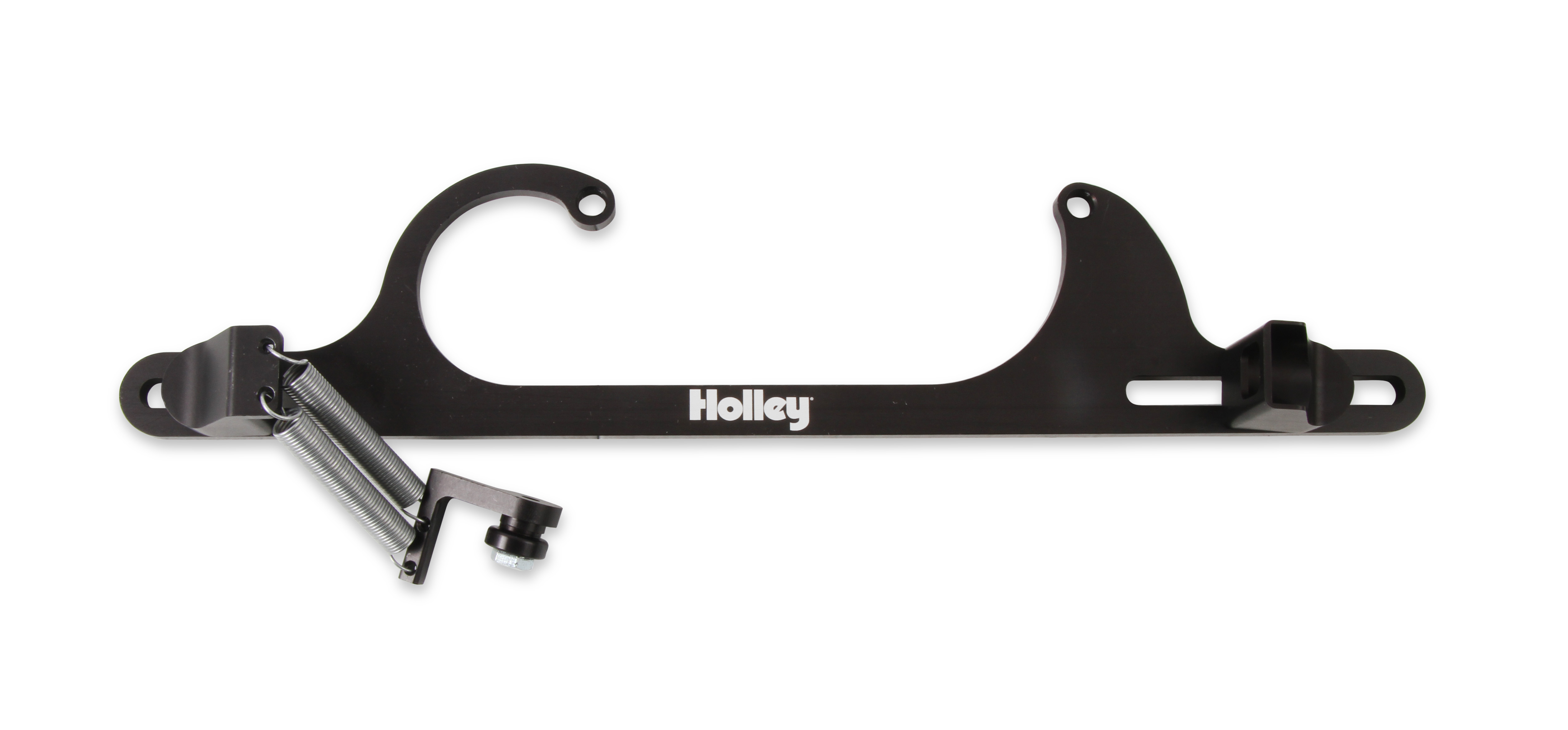 The perfect finishing touch for street rods, street machines and street/strip cars and trucks. Why go cheap on a throttle return bracket when you can get a good looking, quality piece made of billet aluminum? Let's face it, the throttle cable/return spring bracket is one of the first things your eyes focus on when you lift the hood of any car. You can't help but miss it because it's right out there in the open! If you're going the route, go the whole way with something that looks good while providing a real measure of safety. This black anodized bracket is multi-adjustable to work on Holley models 4150 and 4160 carburetors. It includes a dual return spring combination that's perched on a uniquely effective mount. Hardware is all stainless steel to stand up to the rigors of time.The Holley name is boldly engraved and provides a very special touch to this outstanding product.