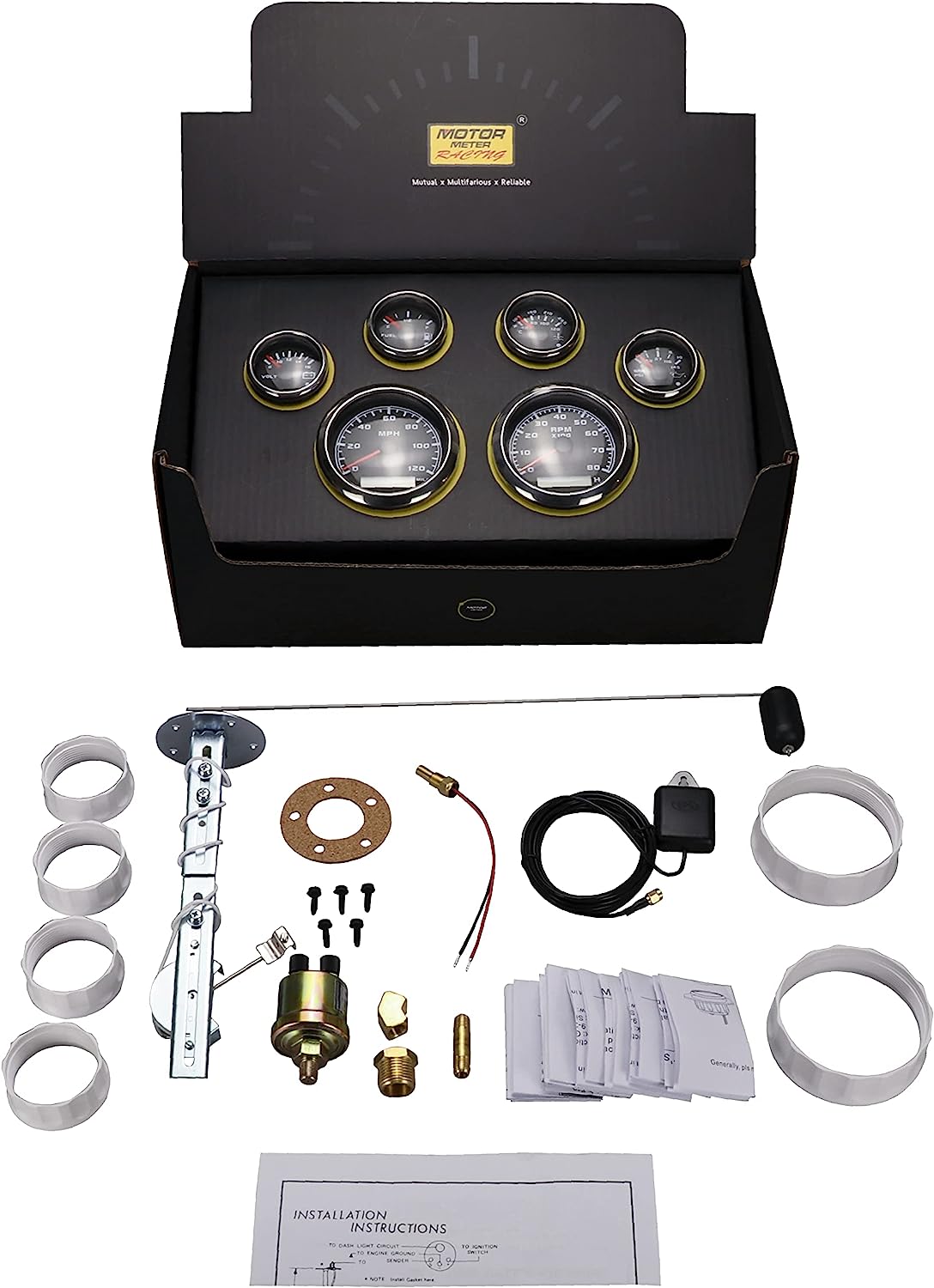 - 6 Gauges, GPS Sensor & Harness, Water Temperature Sensor (Thread Size: 1/8 NPT), Oil Pressure Sensor (Thread Size: 1/8 NPT), Fuel Level Sender (0-90 ohms), Power Harness, Gauge Visor, Installation Instructions.